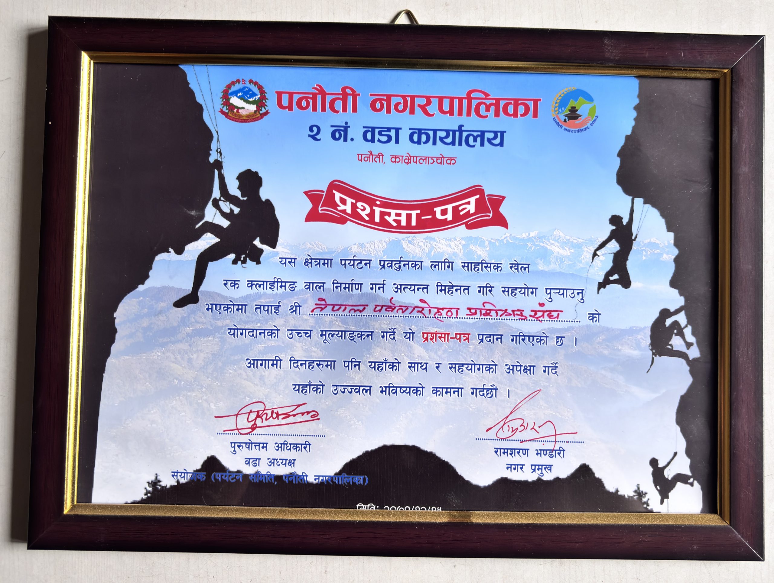 NMIA received a certificate of appreciation from Panauti Municipality Ward No. 2 on March 31, 2023 (17 Chaitra 2079). This was in recognition of NMIA’s contribution to constructing a rock climbing wall to promote tourism in the area.