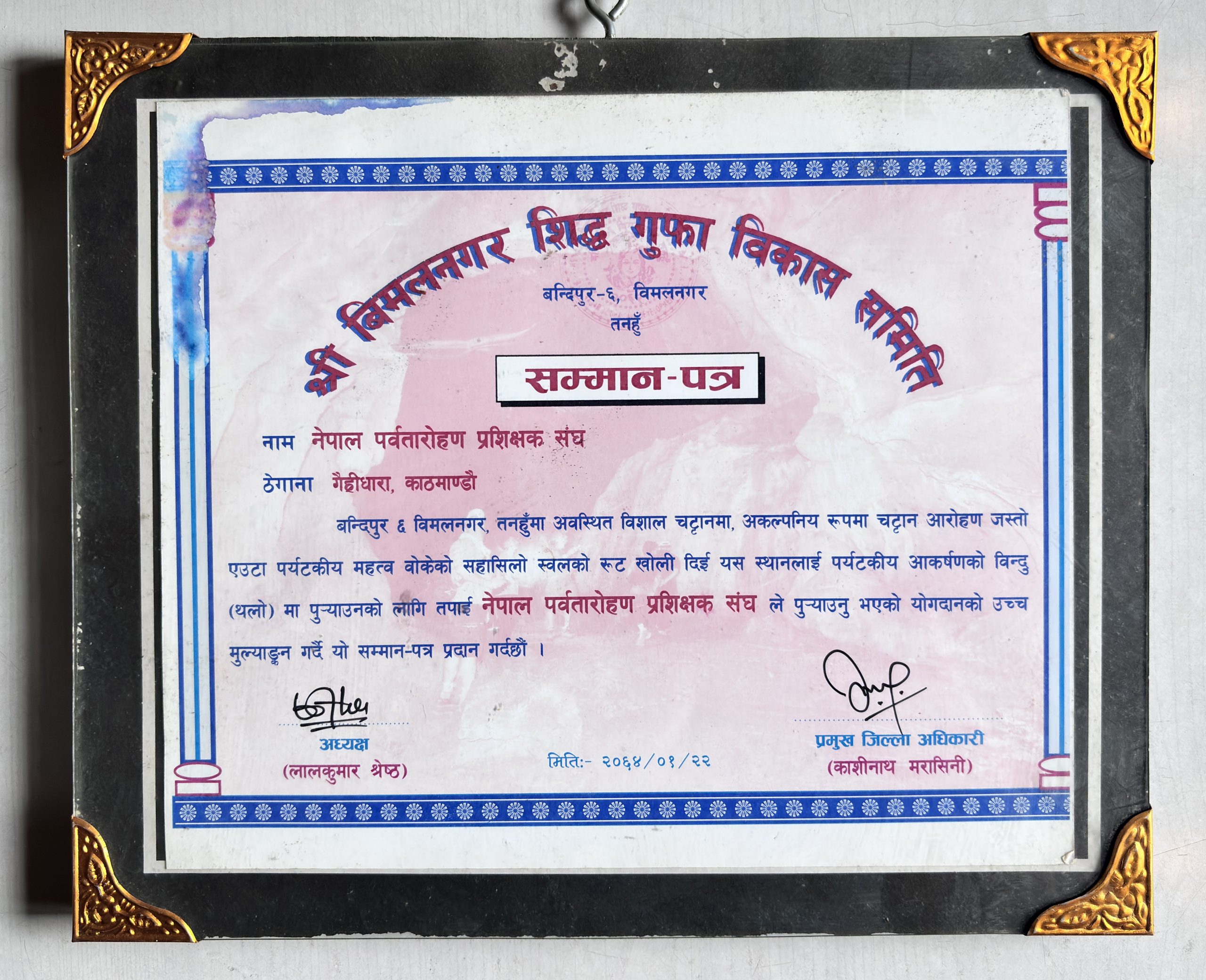 NMIA received a certificate of honor from this committee on April 1, 2007 (22 Baishakh 2064). The award recognized NMIA’s contribution to exploring and promoting the cave climbing route in Bimalnagar, which helped boost local tourism.