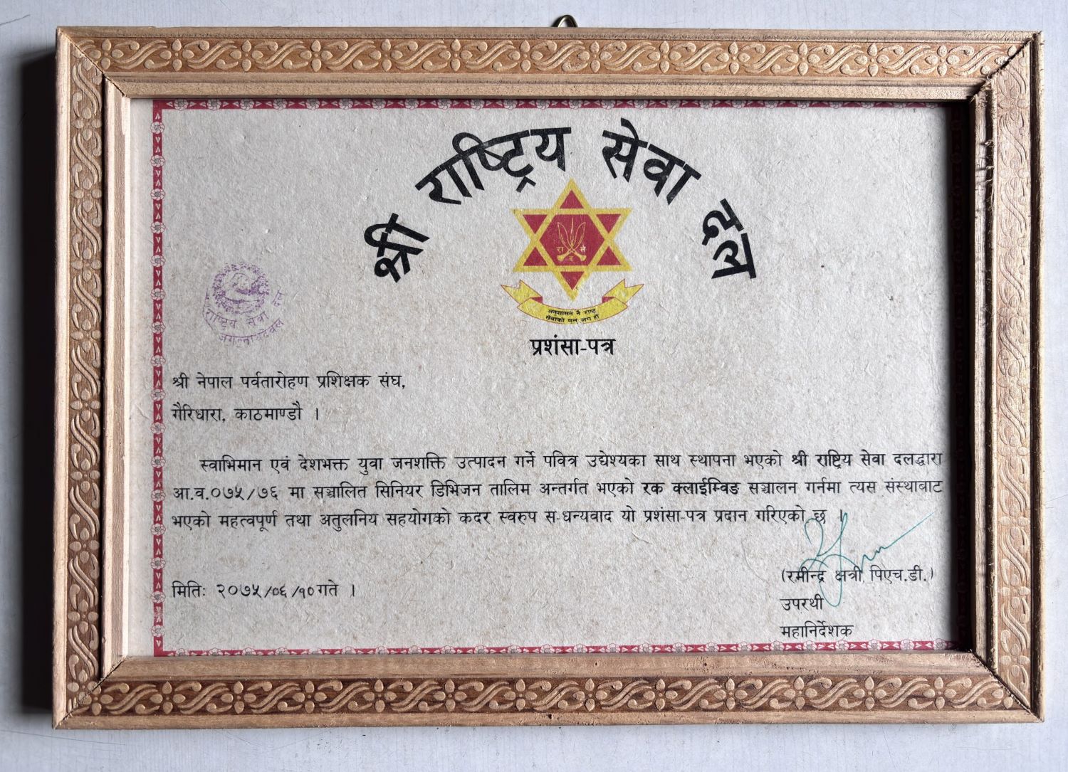 NMIA received a certificate of appreciation from the Indian National Congress’s organization, Rashtra Seva Dal, on September 26, 2018 (10 Ashoj 2075). This was in gratitude for NMIA providing an instructor for senior division rock climbing training.